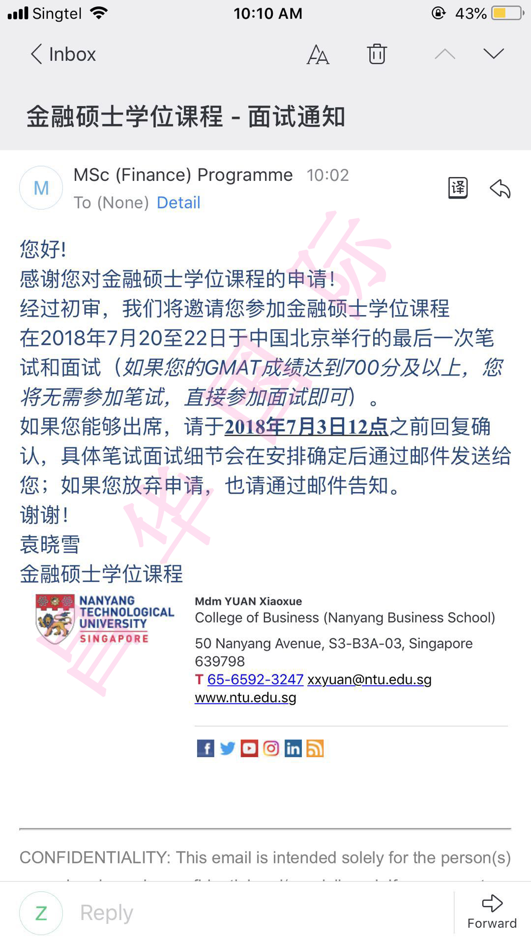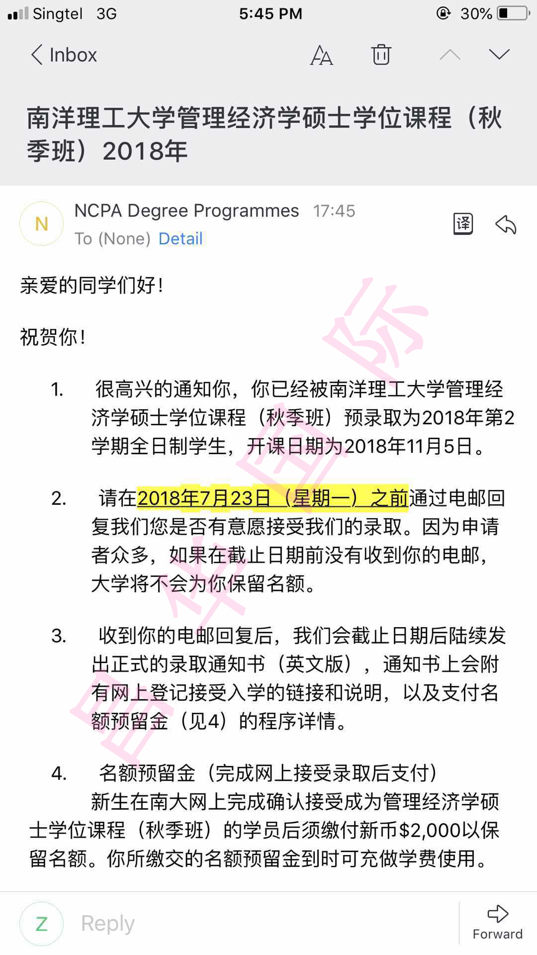 恭喜Z同学顺利拿到新加坡南洋理工大学offer
