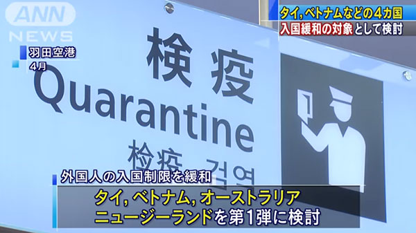 根据日本媒体此前的报道,日本政府讨论的第一批可入境日本的四个国家为:泰国、越南、澳大利亚、新西兰。对象为出于商业目的入境日本的商务人士。