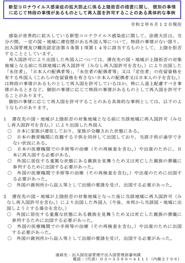 所在国在被列入禁止入境的国家和地区对象之前(一般在4月3日之前),离开日本、且有再入国许可的外国人,根据以下理由可以申请入境。